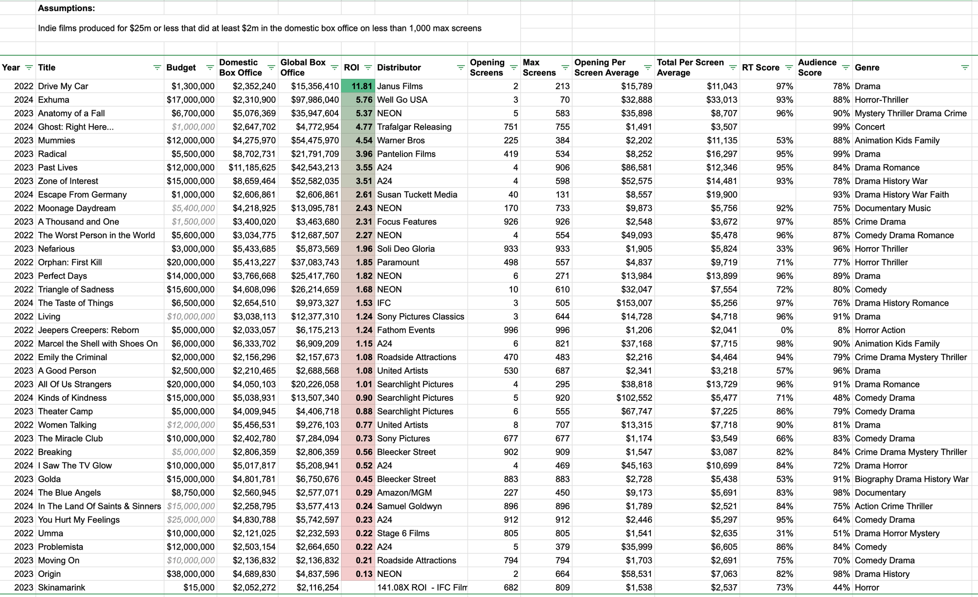 The odds are already against you having a successful release as an independent film. In 2023 there were between 504 and 590 movies released in the US and Canada. Here's some data on the most profitable: