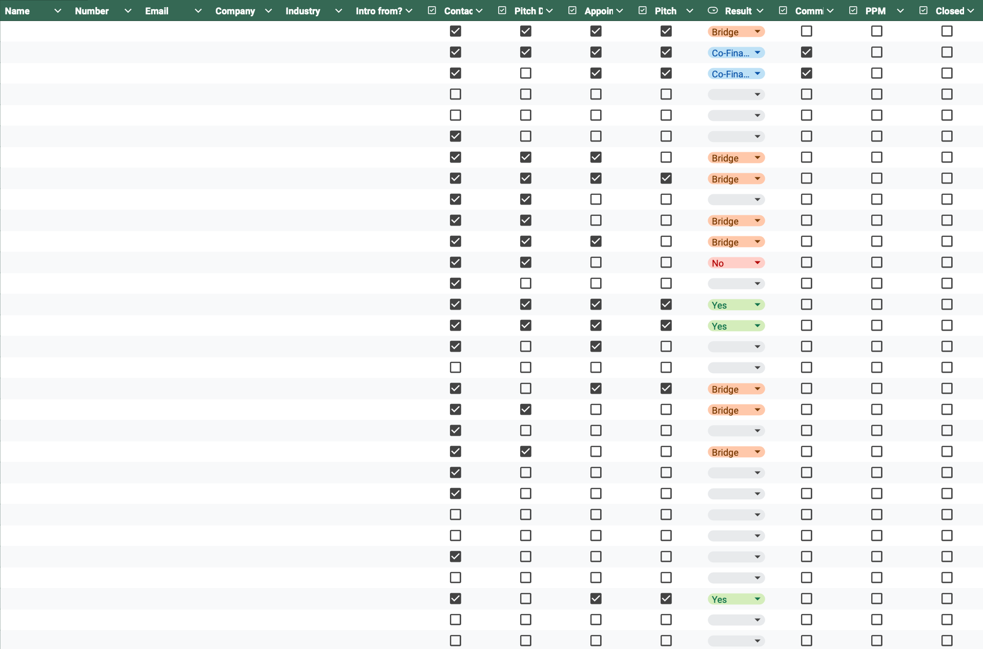 Then checkbox columns for Contacted | Pitch Deck Sent | Appointment | Pitch | Result | Committed | PPM | Closed